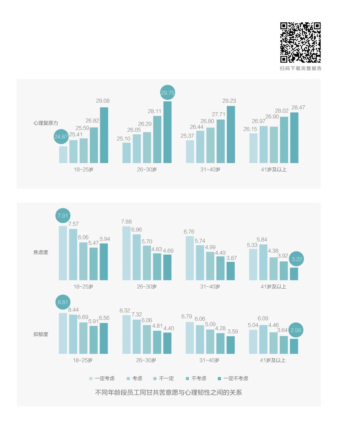 我们回收了上万份问卷的分析结果显示,Z世代在各职级和各工作时限的心理复原力都是最低的,而焦虑和抑郁度水平都是最高的。
