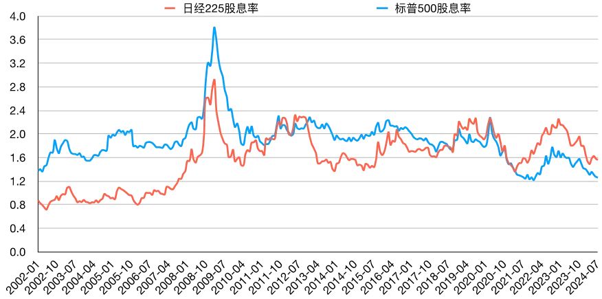图表6:日经225指数与标普500指数股息率(TTM,%)