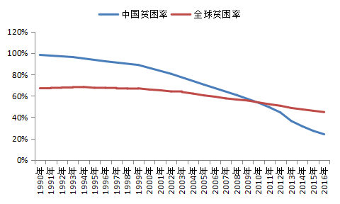 从图表 1可以明显看出,在改革开放之前,中国是一个相当封闭的经济体。伴随着改革开放的深入,中国的外贸额也有了长足的进步。近些年中国外贸额占GDP的比例有所回落,但和改革开放之前相比仍是处于高位之中。图表 2表明中国经济在改革开放之后发展迅速,与全球平均水平之间的差距快速收敛,现在几乎已是相差无几了。图表 3是关于贫困率的数据,中国的数据显示从1990年到2016年,中国的这个指标是快速下降的。由于中国有着庞大的人口基数,因此这意味着有数亿人脱离了贫困。在历史上,这即使不是空前绝后的,也是前无古人的。值得注意的是,在同一时间段内,全球贫困率的降幅有限,其中很大一部分的下降还是由于中国贫困率的大幅下降所致,所以综合来看全球其他国家的贫困率几乎没有太大的变化。
